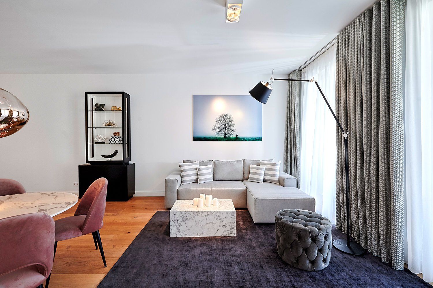 Das Badezimmer mit großer Regendusche und Armaturen von Dornbracht bietet einen Handtuchtrockner, Fußbodenheizung und ausreichend Ablagefläche. Ein Schminkspiegel sorgt für zusätzlichen Komfort. Die Küche von Leicht bietet mit vier Cerankochfeldern, Backofen, Mikrowelle und Kühlschrank mit Gefrierfach alle Annehmlichkeiten, die man sich wünscht. Toaster und Wasserkocher von Alessi, eine Nespresso-Kaffeemaschine und eine Filterkaffeemaschine sorgen für ein perfektes Frühstück. Die vollausgestattete Küche punktet zudem mit hochwertigen Küchenhelfern von Rösle, WMF, Iittala, Asa, Sambonet etc.. Im Wohnzimmer befindet sich eine hochwertige Schlafcouch, die in wenigen Handgriffen zu einem schönen Schlafplatz mit einer Liegefläche von 120x200cm für eine weitere Person wird.