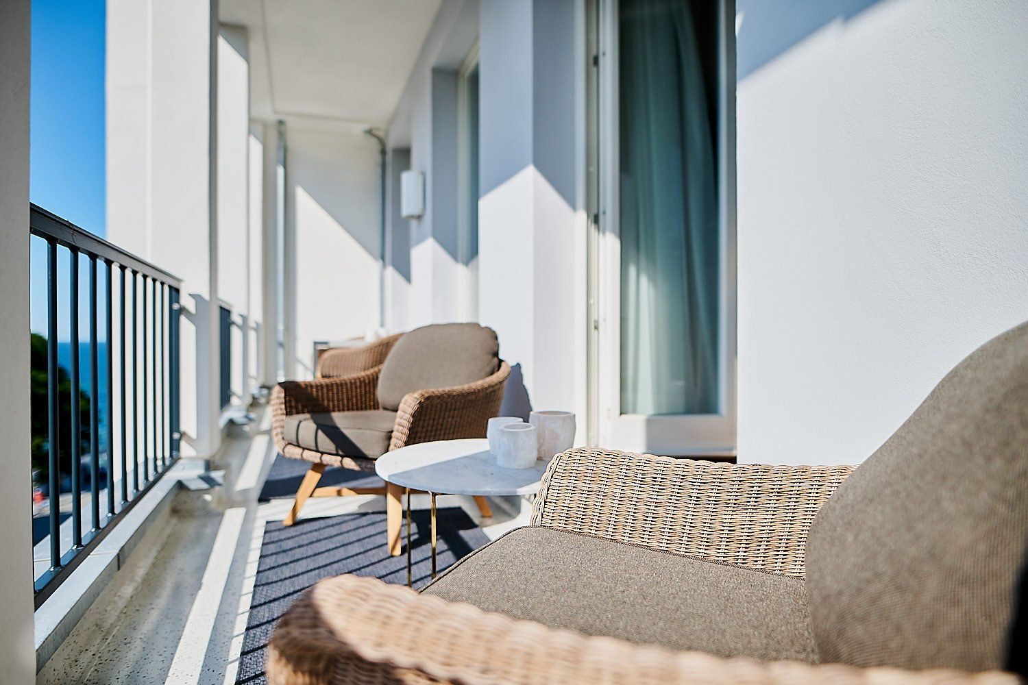Für die vierbeinigen Freunde stehen ein Fress- und Trinknapf von Riviera Maison bereit. Der große überdachte Balkon erstreckt sich über die gesamte Breite der Wohnung und ist mit einer Essgruppe und einer Lounge-Sitzgruppe ausgestattet. Die hochwertigen Möbel von Riviera Maison versprühen maritimen Flair. Der seitliche Blick auf die Ostsee und die Kreidefelsen in der Ferne laden zum Träumen ein. Der Balkon ist vom Schlafzimmer und Wohnzimmer aus begehbar. Die komplette Wohnung ist mit hochwertigem gekalktem Eichenparket und Fußbodenheizung ausgestattet, die wunderschönen Kassettentüren aus Vollholz und die Holzfenster sind weitere hochwertige Details der Wohnung. Die 2,70m hohen Räume verbreiten Altbaucharme mit dem Komfort eines Neubaus. Die bodentiefen Panoramafenster lassen das Sonnenlicht herein und sorgen für eine lichtdurchflutete Wohnung. Für eine bequeme Anreise mit dem eigenen Auto finden Sie einen privaten Stellplatz in der hauseigenen Tiefgarage. Alle Etagen (von der Tiefgarage bis zum SPA auf dem Dach) lassen sich bequem mit einem großen Aufzug erreichen. Ein abschließbarer, von Außen und Innen erreichbarer Fahrradraum und ein Waschkeller mit Waschmaschinen und Trocknern steht Ihnen als unser Gast ebenfalls zu Verfügung.